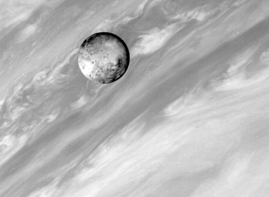 Read moreVoyager 1 took this photo of Jupiter and two of its satellites (Io, left, and Europa) on February 13, 1979. Io is about 350,000 kilometers (220,000 miles) above Jupiter's Great Red Spot; Europa is about 600,000 kilometers (375,000 miles) above Jupiter's clouds. Although both satellites have about the same brightness, Io's color is very different from Europa's. Io's equatorial region show two types of material—dark orange, broken by several bright spots—producing a mottled appearance. The poles are darker and reddish. Preliminary evidence suggests color variations within and between the polar regions. Io's surface composition is unknown, but scientists believe it may be a mixture of salts and sulfur. Europa is less strongly colored, although still relatively dark at short wavelengths. Jupiter is about 20 million kilometers (12.4 million miles) from the spacecraft. #