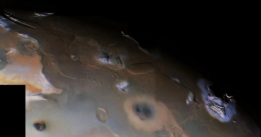 Read moreThis Voyager 1 image mosaic shows Io's south polar region. Haemus Mons, a 10-kilometer-high (32,000-foot) mountain is at right. Elsewhere, much flatter volcanic plains, eroded volcanic plateaus, and crater-like volcanic calderas dominate the scene. The composition of the prevalent volcanic plains of Io could consist dominantly of sulfur with a thin discontinuous coating of sulfur dioxide frost or of silicates (such as basalt) coated with sulfurous condensates. #