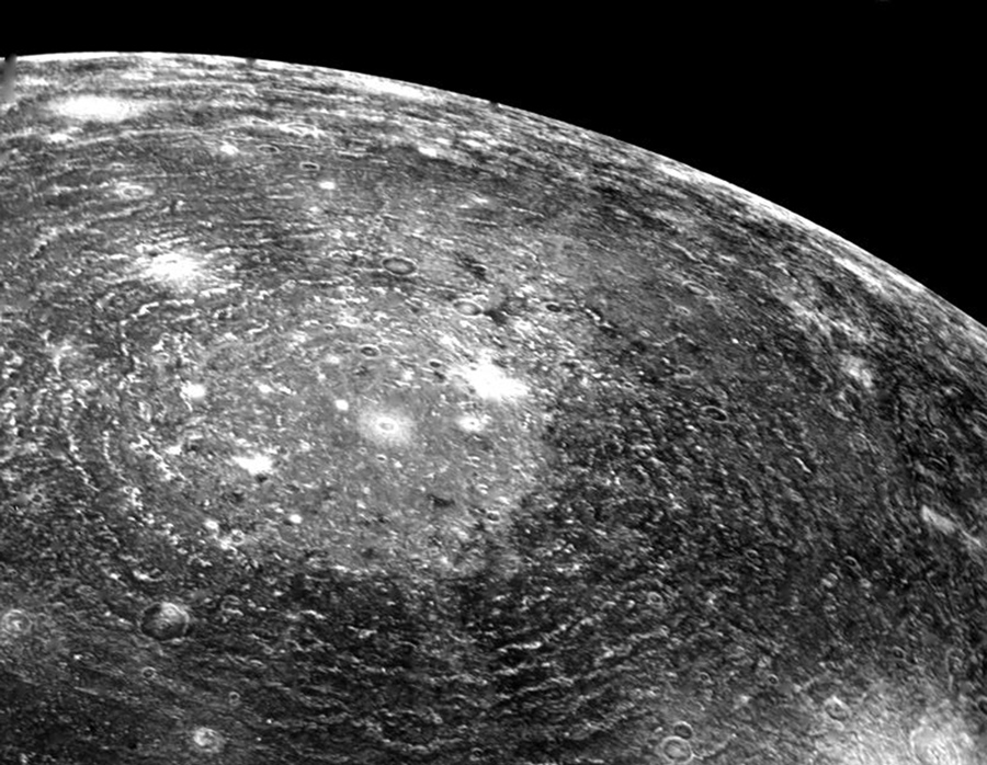 Read moreThis picture of a multi-ring basin on Callisto was taken the morning of March 6, 1979, from a distance of about 200,000 kilometers. The complicated circular structure seen at left-center is similar to the large circular impact basins that dominate the surface of the Earth's moon and also the planet Mercury. The inner parts of these basins are generally surrounded by radially lineated ejecta and several concentric mountainous ring structures that are thought to form during the impact event. The great number of rings observed around this basin on Callisto is consistent with its low planetary density and probable low internal strength. #