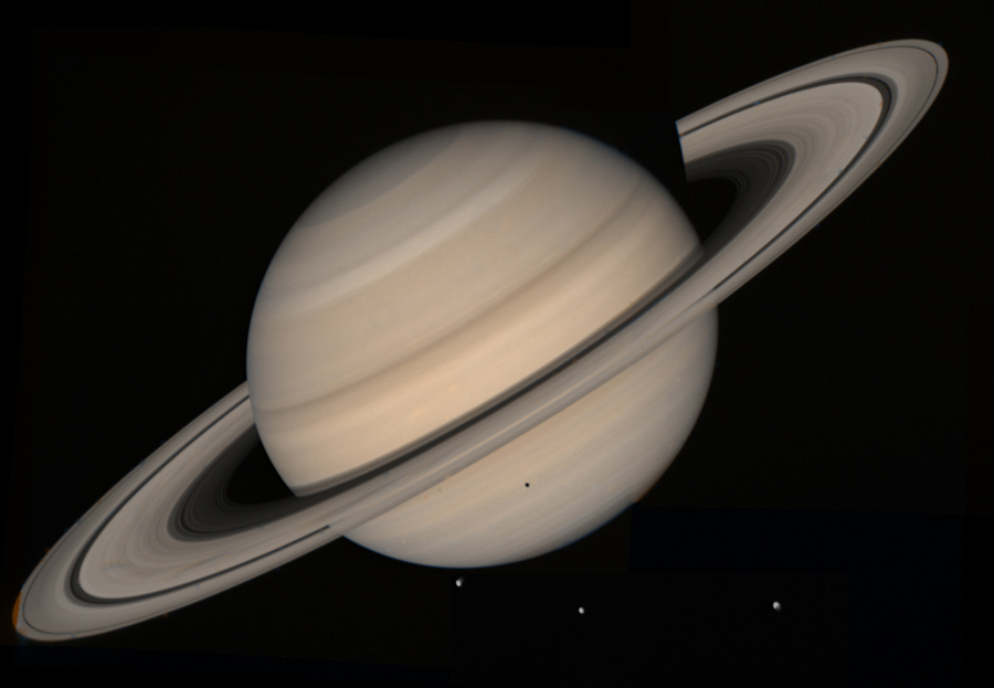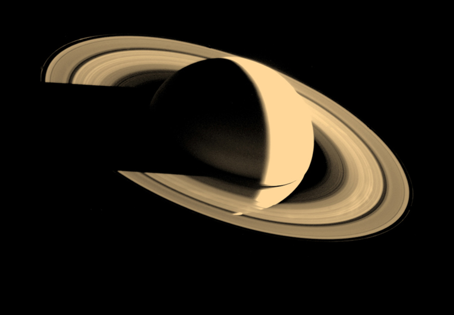 Read moreVoyager 1 looked back at Saturn on November 16, 1980, four days after the spacecraft flew past the planet, to observe the appearance of Saturn and its rings from this unique perspective. A few of the spokelike ring features discovered by Voyager appear in the rings as bright patches in this image, taken at a distance of 5.3 million kilometers (3.3 million miles) from the planet. Saturn's shadow falls upon the rings, and the bright Saturn crescent is seen through all but the densest portion of the rings. #