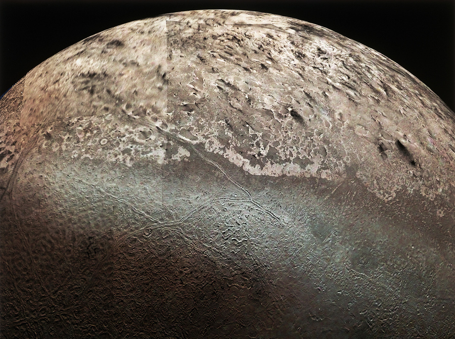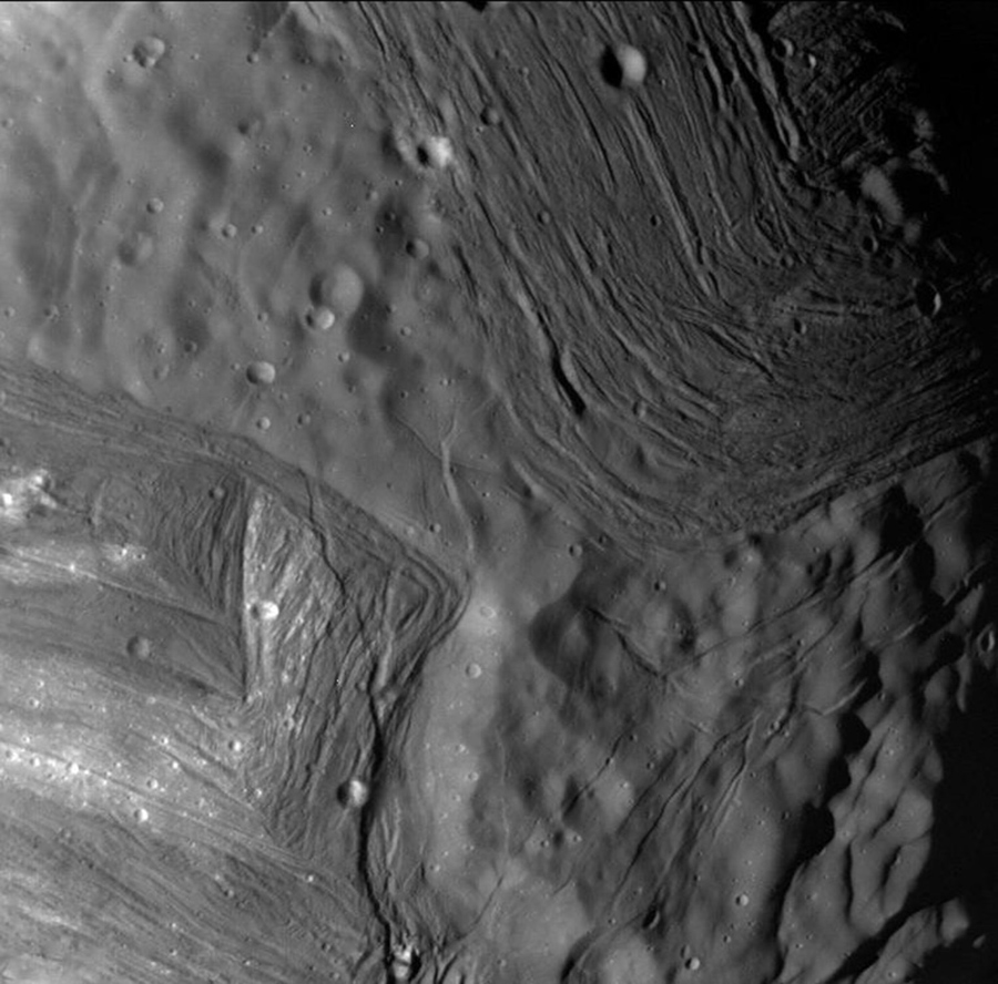 Read moreThis computer-assembled mosaic of Miranda includes many of the high-resolution frames obtained by Voyager 2 during its close flyby of the Uranian moon. Miranda, roughly 500 kilometers (300 miles) in diameter, exhibits varied geologic provinces, seen in this mosaic of clear-filter, narrow-angle images from January 24, 1986. On Miranda, ridges and valleys of one province are cut off against the boundary of the next province. Probable compressional (pushed-together) folded ridges are seen in curvilinear patterns, as are many extensional (pulled-apart) faults. Some of these show very large scarps, or cliffs, ranging from 0.5 to 5 kilometers (0.3 to 3 miles) in height—that is, higher that the walls of the Grand Canyon on Earth. #