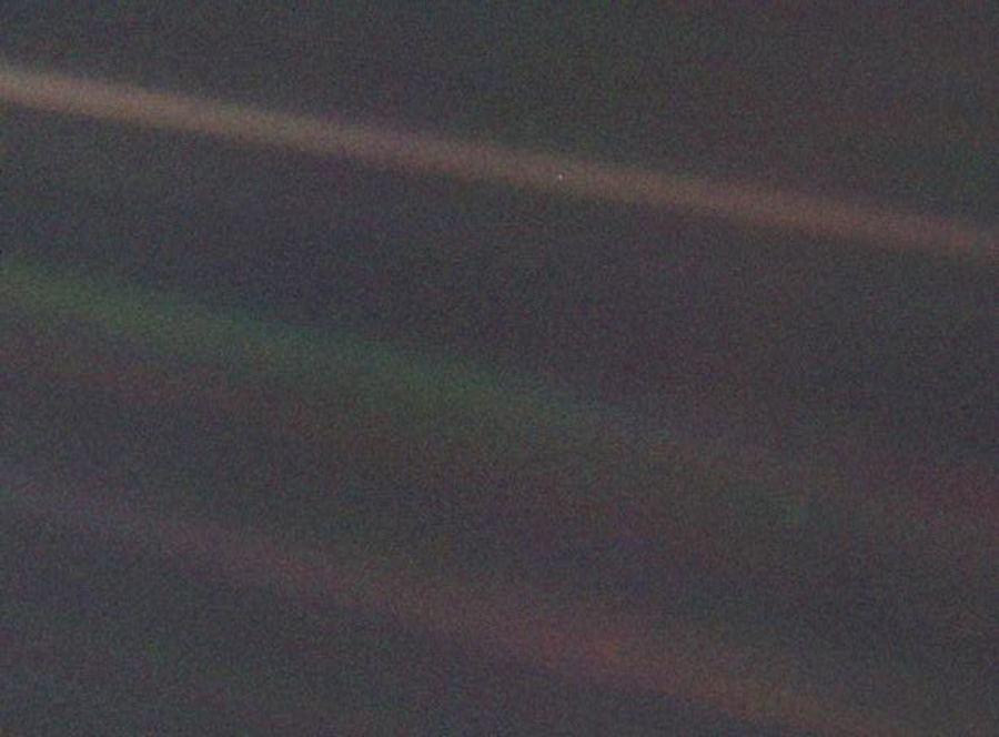 Read moreThis narrow-angle color image of the Earth, dubbed "Pale Blue Dot," is a part of the first-ever "portrait" of the solar system taken by Voyager 1. The spacecraft acquired a total of 60 frames for a mosaic of the solar system from a distance of more than 4 billion miles from Earth and about 32 degrees above the ecliptic. From Voyager's great distance Earth is a mere point of light, less than the size of a picture element even in the narrow-angle camera. Earth was a crescent only 0.12 pixels in size. Coincidentally, Earth lies right in the center of one of the scattered light rays resulting from taking the image so close to the sun. In 1994, Carl Sagan said of this image: "That's here. That's home. That's us. On it, everyone you ever heard of, every human being who ever lived, lived out their lives. The aggregate of all our joys and sufferings, thousands of confident religions, ideologies, and economic doctrines, every hunter and forager, every hero and coward, every creator and destroyer of civilizations, every king and peasant, every young couple in love, every hopeful child, every mother and father, every inventor and explorer, every teacher of morals, every corrupt politician, every superstar, every supreme leader, every saint and sinner in the history of our species, lived there—on a mote of dust, suspended in a sunbeam." #