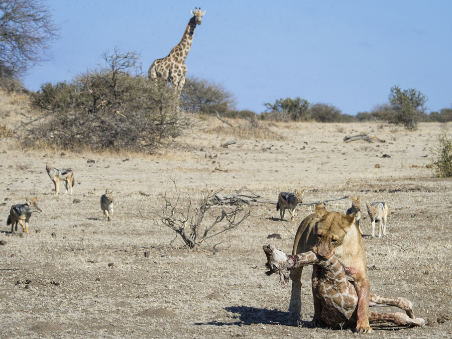 Read more"A Sad Story for a Mother Giraffe." A very emotional scene of a lioness dragging a recently killed baby giraffe, only a few days old, with the mother giraffe looking on. #
