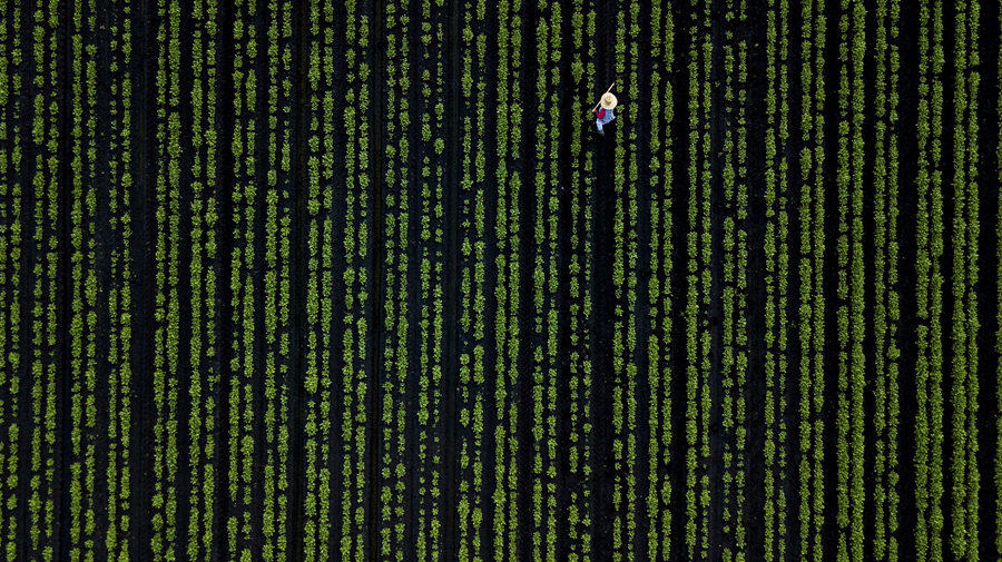 Read more"Migrant in the Muck Field." Migrant workers come from Mexico and other countries farther south to the Ohio muck fields. The big white hats they are wearing protect them from the hot summer sun. Together with the black and green lines, this image comes to its artistic right. #