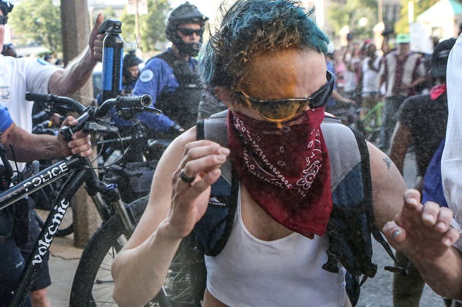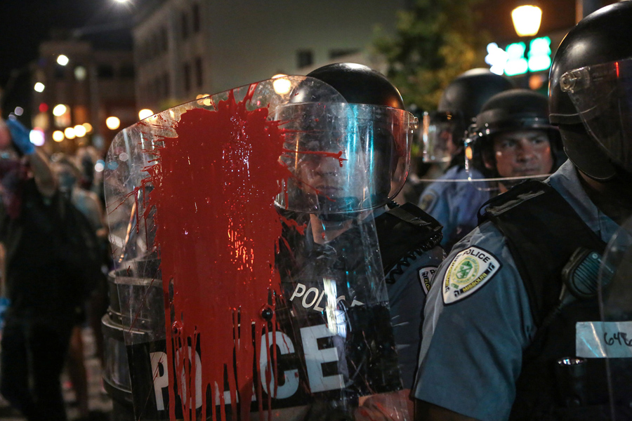 Read moreA protester is sprayed with mace by riot police after throwing a chair through a window of a business during the second night of demonstrations in St. Louis, on September 16, 2017. #
