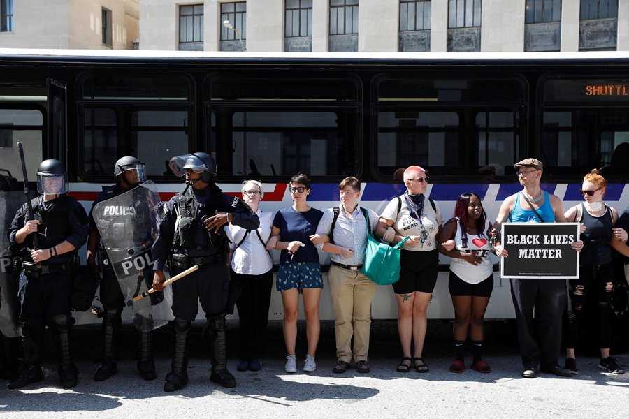 Read morePolice disembark from a bus as protesters lock arms preventing the bus from moving during a standoff with protesters on Tucker Boulevard in downtown St. Louis, on September 15, 2017. #