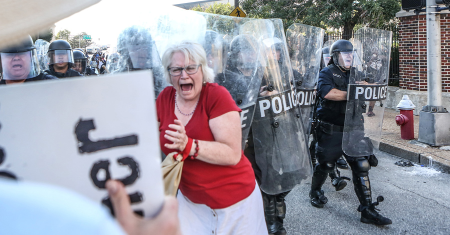 Read moreA woman reacts as she is pushed by police in riot gear during a protest after the not-guilty verdict in the murder trial of former St. Louis police officer Jason Stockley, in St. Louis, on September 15, 2017. #