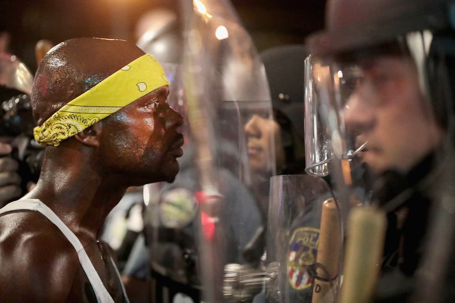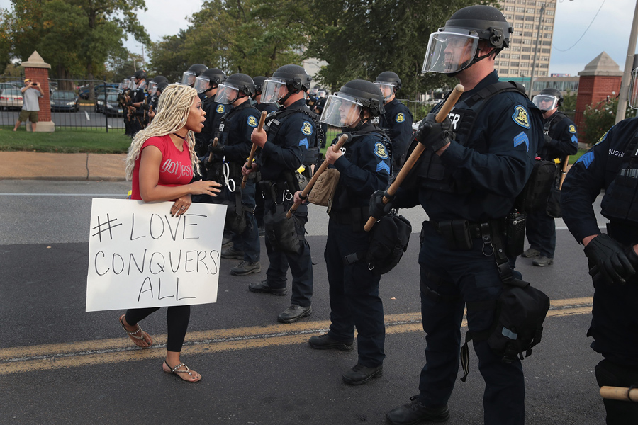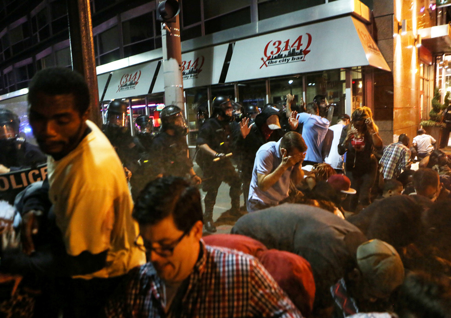 Read moreDemonstrators confront police while protesting the acquittal of former St. Louis police officer Jason Stockley, in St. Louis, Missouri, on September 16, 2017. Dozens of business windows were smashed and at least two police cars were damaged during a second day of protests following the acquittal of Stockley, who was charged with first-degree murder last year following the 2011 on-duty shooting of Anthony Lamar Smith. #