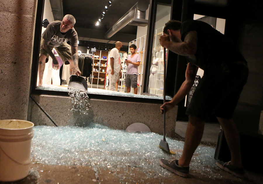 Read moreGlass shatters as a protester throws a brick through a window of a restaurant filled with patrons during the second night of demonstrations in St. Louis on September 16, 2017. #