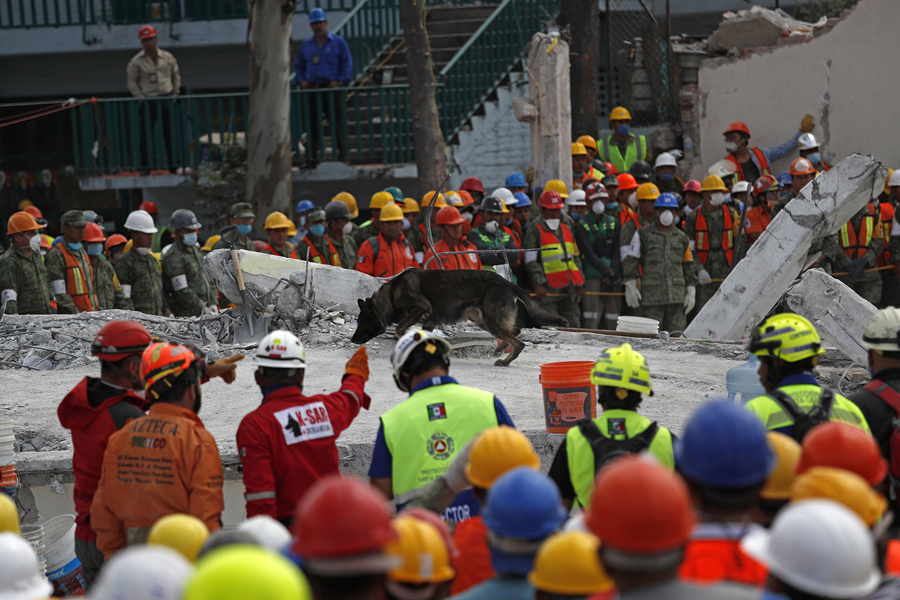 Read moreRescue workers and a trained dog search for children trapped inside the collapsed Enrique Rebsamen school in the Coapa area of Tlalpan, Mexico City, on September 19, 2017. #
