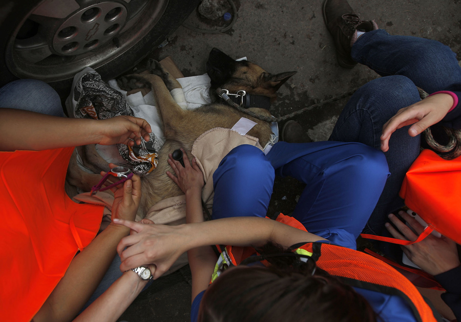 Read moreA rescue dog is helped to recuperate by volunteers in the Ciudad Jardin neighborhood of Mexico City on September 21, 2017. Thousands of professionals and volunteers are working frantically at dozens of wrecked buildings across the capital and nearby states looking for survivors of the powerful quake that hit Tuesday. #