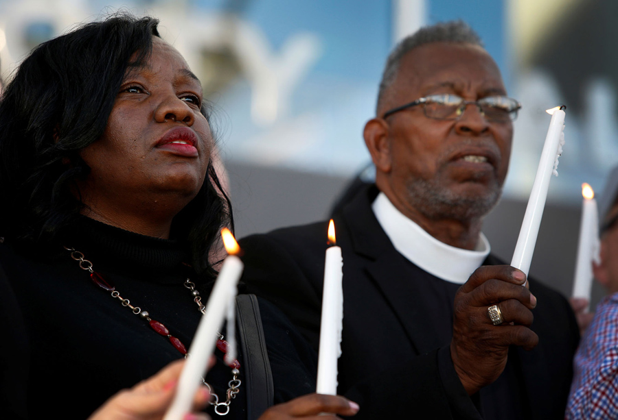 Read moreTiffany Tyler and Pastor William McCurdy hold candles during a prayer vigil in honor of those affected by the shooting on the Las Vegas Strip in front of Las Vegas City Hall on October 2, 2017. #
