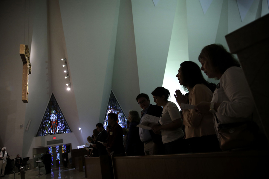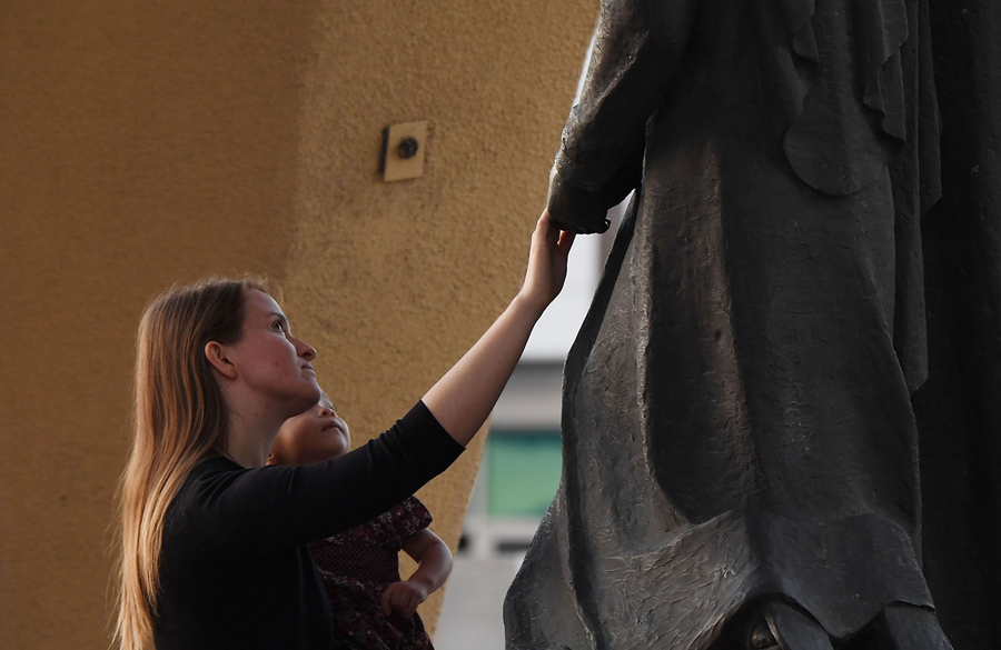 Read moreA woman touches a statue of the Blessed Mother Mary during a vigil at Guardian Angel Cathedral for the victims of the Route 91 Harvest country music festival shootings on October 2, 2017, in Las Vegas. #