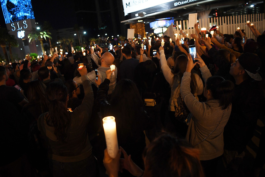Read moreMourners attend a candlelight vigil at the corner of Sahara Avenue and Las Vegas Boulevard for the victims of Sunday night's mass shooting on October 2, 2017, in Las Vegas, Nevada. #