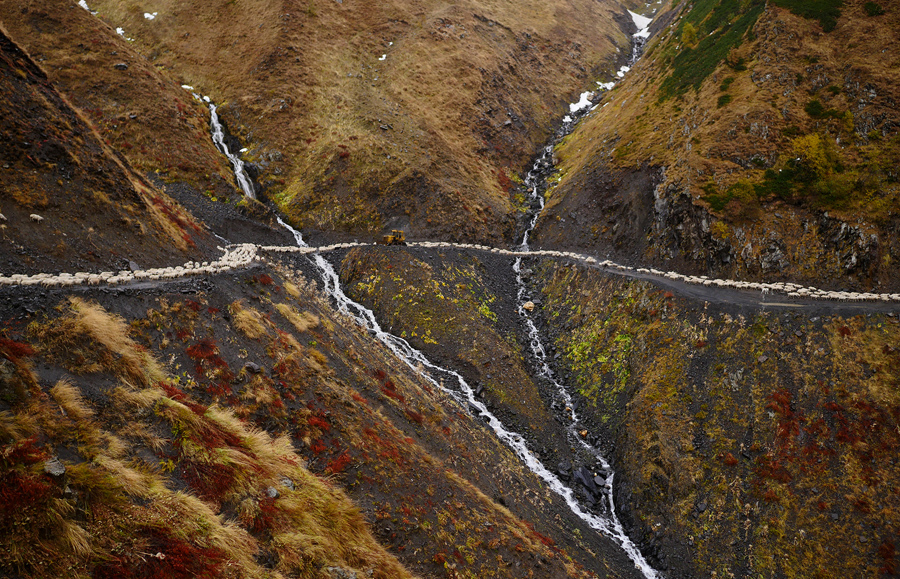 Every autumn, a spectacular animal migration takes place in Georgia’s Tusheti region in the northern Caucasus Mountains. Radio Free Europe photographer Amos Chapple recently joined a group of shepherds and their dogs on what he refers to as a “deadly, boozy journey” from the steep mountains to the plains, as they brought their 1,200 sheep down to their winter pastures.