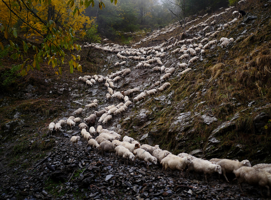 Read moreOn the other side of the pass the men turn off the serpentine road and direct the flock straight down the mountainside. The sticks the men use for thwacking wayward sheep come in handy on the risky descent. #