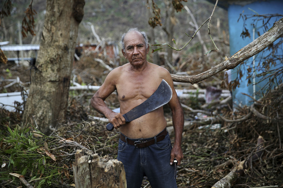 Read moreU.S. Army veteran Luis Cabrera Sanchez holds his machete as he pauses for a portrait while clearing debris from his damaged home, with family and neighbors, in the aftermath of Hurricane Maria in Yabucoa, Puerto Rico, on September 29, 2017. Sanchez, who served in the military from 1966 to 1969, said his greatest needs are water, food, and energy. #