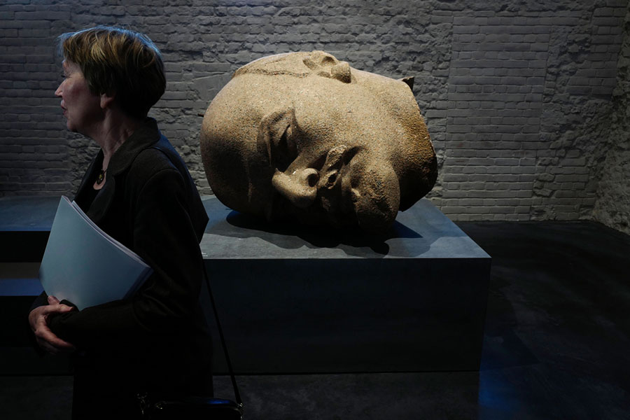 Read moreMuseum and project director Andrea Theissen stands next to the head of a 19-meter statue of former Soviet leader Vladimir Lenin at the permanent exhibition, "Unveiled, Berlin and its Monuments," as she speaks to reporters in Berlin's Spandau Citadel Museum on April 27, 2016. The exhibition illustrates German history through the many monuments and memorials that have appeared in the capitol since the early 18th century. #