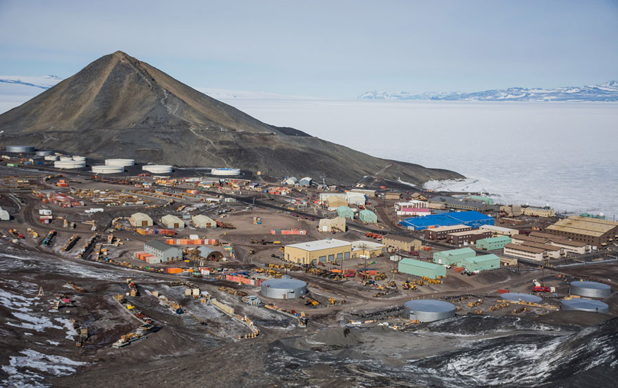 Read moreMcMurdo Station, Ross Island, Antarctica, as seen from the radar dome at the top of the hill behind the station on January 22, 2017. This view is to the south, with Observation Hill, at 750 feet tall, in the middle distance. White fuel storage tanks are located at the base of the hill. The flat white to the right of the hill is the annual sea ice of McMurdo Sound. #