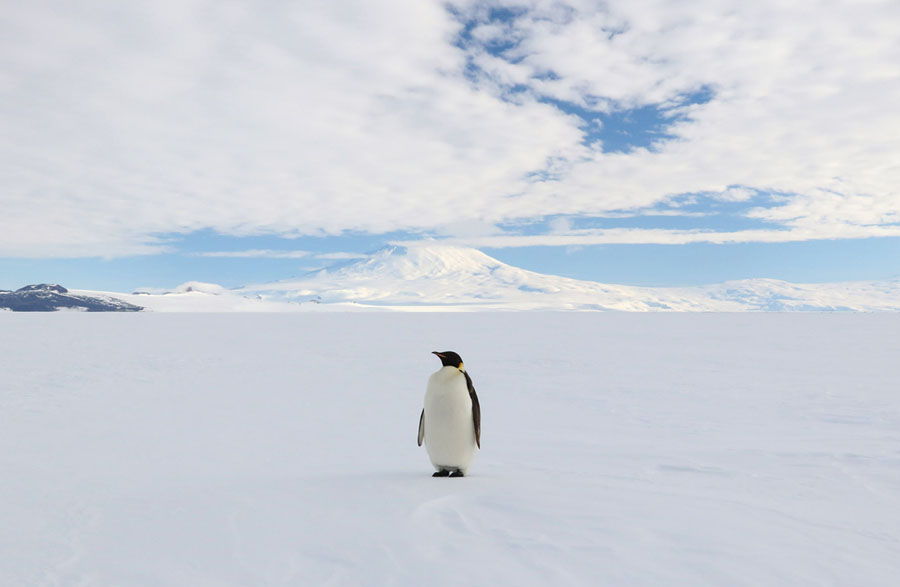 Read moreAn emperor penguin, the largest of all penguins, stands proudly on the McMurdo Ice Shelf with Mount Erebus in the distance on January 23, 2017. Mount Erebus is the southernmost active volcano on Earth. #