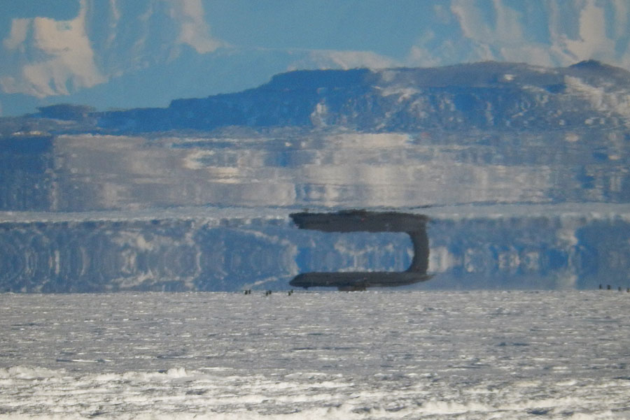 Read moreA 757 jet on McMurdo's Pegasus Ice Runway is distorted by a Fata Morgana mirage on March 23, 2016. This optical illusion is caused by a layer of warm air above the cold surface. In this image the tail of the jet is connected to an inverted image of the same aircraft. #