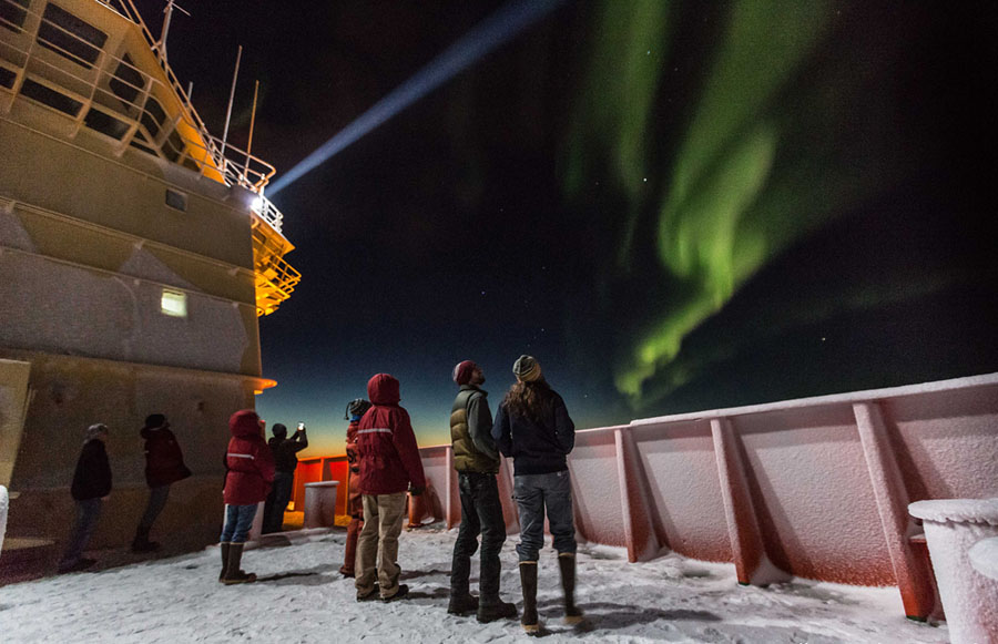 Read morePassengers aboard the National Science Foundation research vessel Nathaniel B. Palmer observe auroras in the winter sky. The ship was in the Ross Sea on a winter cruise on May 20, 2017. #