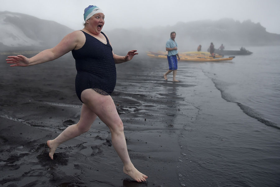 Read moreTourists run to bathe in the hot springs of the crater lake on Deception Island, Antarctica, on March 6, 2016. The Antarctic tourism industry is generally considered to have begun in the late 1950s when Chile and Argentina took more than 500 fare-paying passengers to the South Shetland Islands aboard a naval transportation ship. #