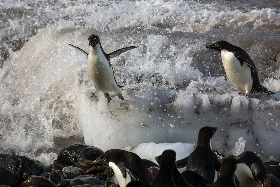 Read moreAn Adelie penguin catches some crashing waves as it returns to shore after feeding in the waters off Cape Crozier on January 27, 2017. The penguin colony there is one of the largest known Adelie penguin colonies in the world, home to roughly half a million birds. #