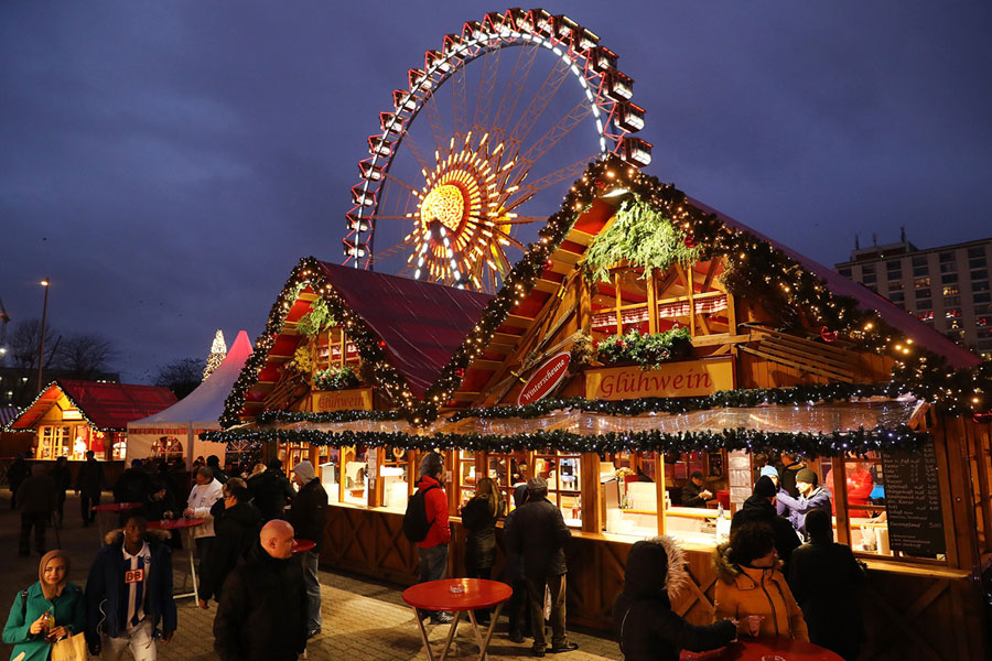Read moreVisitors walk among stalls selling mulled wine and food as an illuminated Ferris wheel spins behind at the annual Christmas market at Alexanderplatz on November 28, 2017, in Berlin, Germany. #