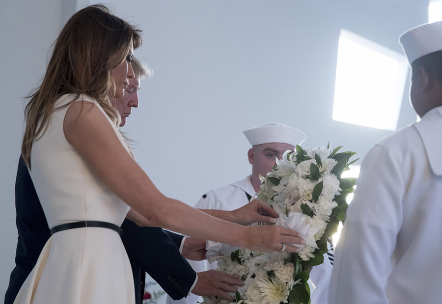 Read morePresident Donald Trump and First Lady Melania Trump participate in a wreath laying ceremony at the USS Arizona Memorial, part of the World War II Valor in the Pacific National Monument, in Joint Base Pearl Harbor-Hickam, Hawaii, adjacent to Honolulu, on November 3, 2017. Trump paid a solemn visit to Pearl Harbor and its memorial to the USS Arizona, a hallowed place he said he had read about, discussed and studied, but had never visited until just before his first official visit to Asia. #