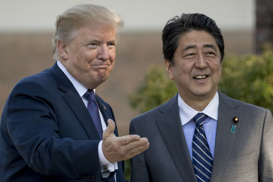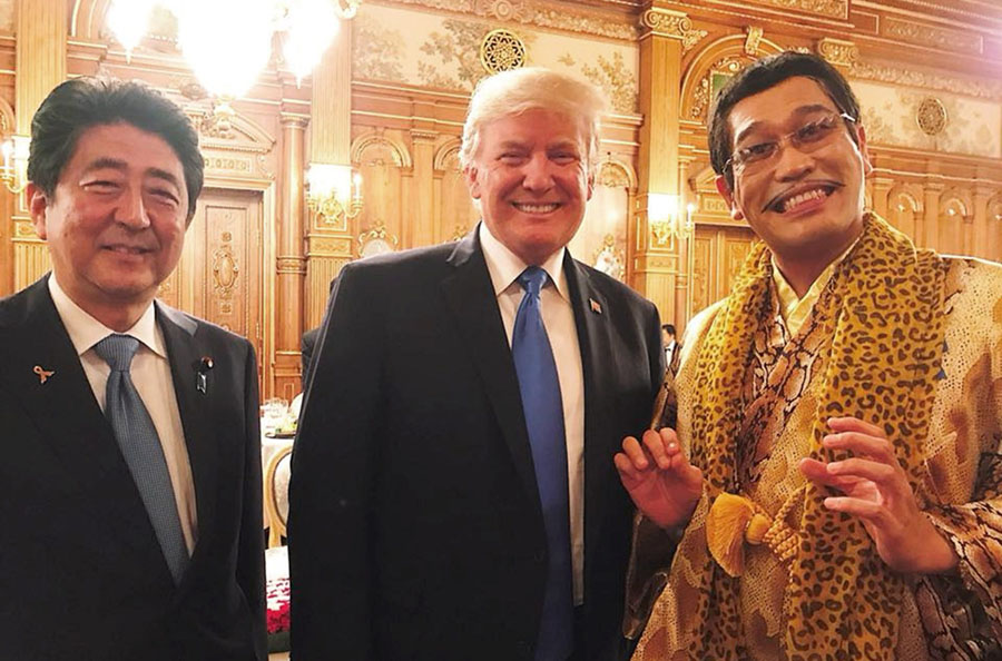 Read moreJapanese pop star Pikotaro (right), most famous for his "Pen-Pineapple-Apple-Pen" song, poses with Prime Minister Abe and President Trump during an official dinner in Trump's honor at Akasaka Palace on November 6, 2017. Reportedly, Abe was aware that Trump’s granddaughter is a fan of Pikotaro, and arranged the meeting. #