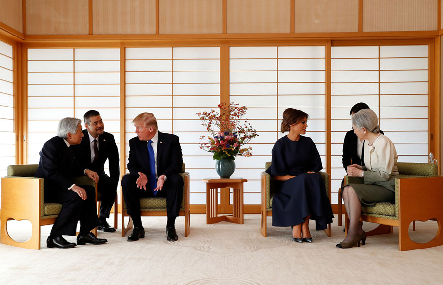 Read moreJapan's Emperor Akihito (left) visits with President Trump while First Lady Melania Trump talks with Empress Michiko (right) inside the Imperial Palace in Tokyo, Japan, on November 6, 2017. #