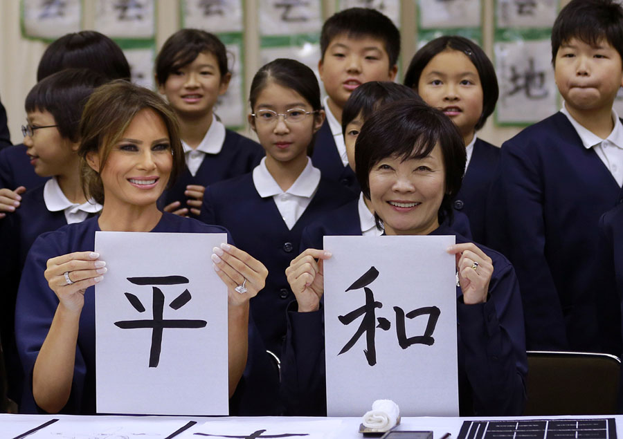 Read moreFirst Lady Melania Trump, left, and Japanese Prime Minister Shinzo Abe's wife, Akie, show off calligraphy they wrote as they attended a fourth grade calligraphy class at Kyobashi Tsukiji Elementary School in Tokyo, on November 6, 2017. The calligraphy, combined, reads, "Peace." #