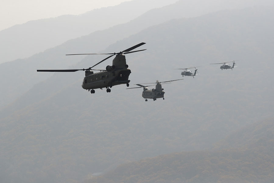 Read moreSecret Service Counter-Assault Team members ride in a support helicopter as President Trump travels towards the Demilitarized Zone, the tense military border between the two Koreas, on November 8, 2017. Marine One turned back because of a bad weather call just minutes away from arriving. #