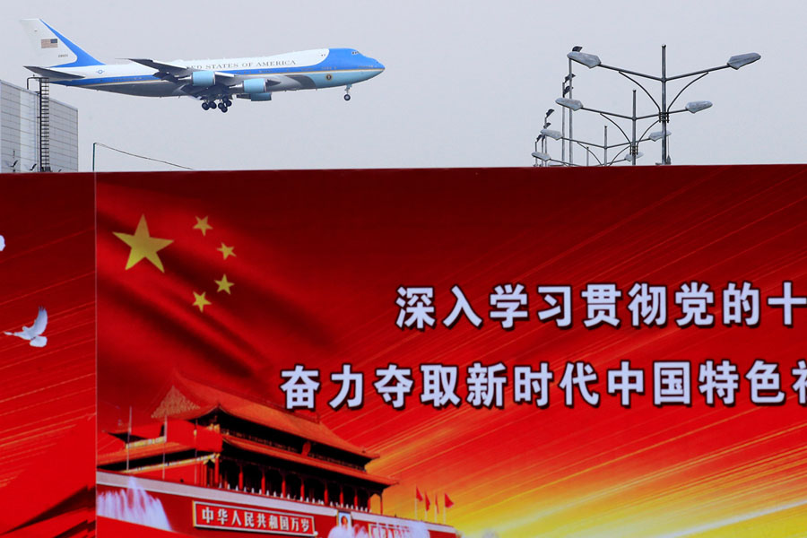 Read moreAir Force One arrives at Beijing, China, on November 8, 2017. The slogan on the sign in front is a message from the ruling Communist Party calling on citizens to fight hard for a new era of Chinese socialism. #