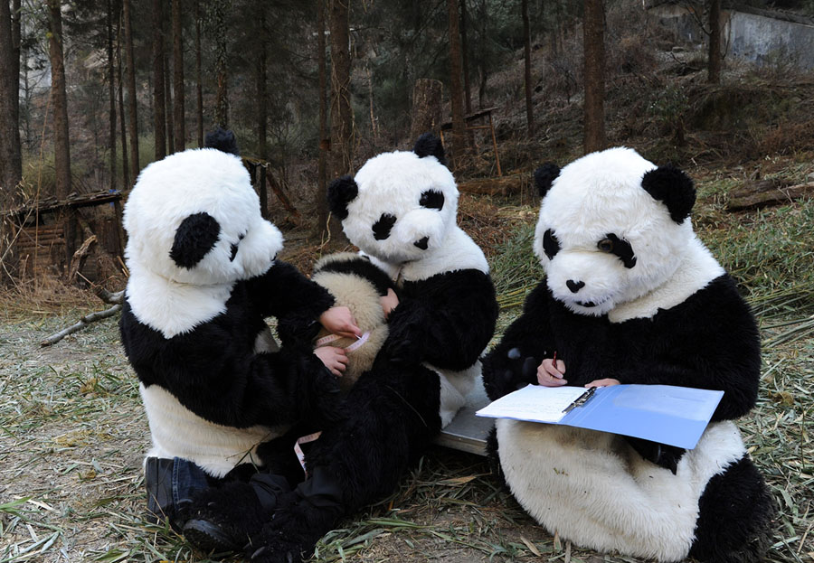 Read moreResearchers dressed in panda costumes check the body temperature of a panda cub during its physical examination at the Hetaoping Research and Conservation Center on December 3, 2010. #