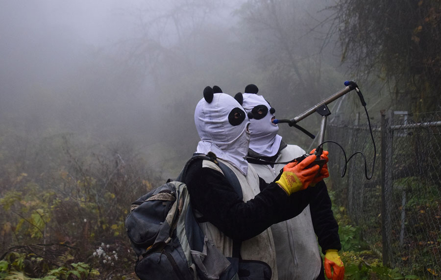 Read moreWorkers wearing panda masks use a wireless device to detect the location of Yingxue, a panda which has received survival training, at a protection base before reintroducing it to the wild, in Wolong, Sichuan province, China, on November 20, 2017. #