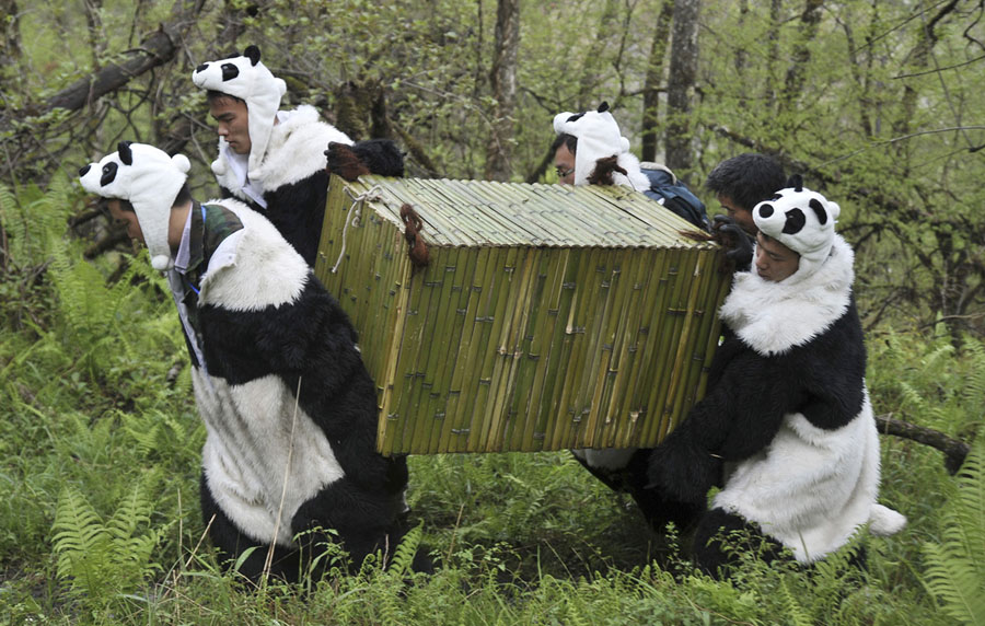 Read moreResearchers dressed in panda costumes carry a cage as they transfer giant panda Tao Tao to a new living environment at the Hetaoping Research and Conservation Center for the Giant Panda on May 3, 2012. #
