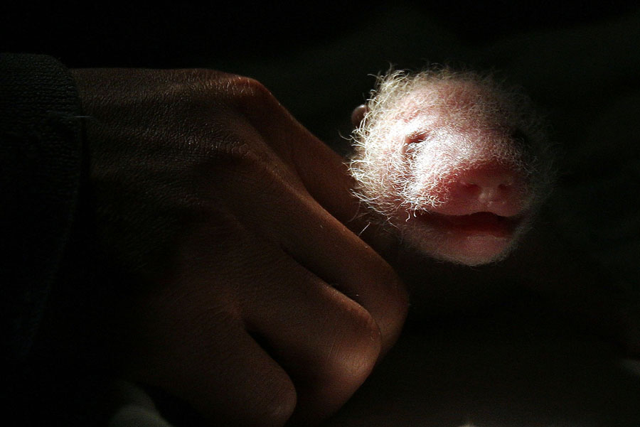 Read moreA newborn male panda cub is seen near the hand of its feeder at the Wolong Giant Panda Protection Center on August 23, 2006. Giant panda Xi Mei gave birth to a pair of twins 11 days earlier. #
