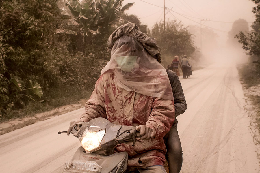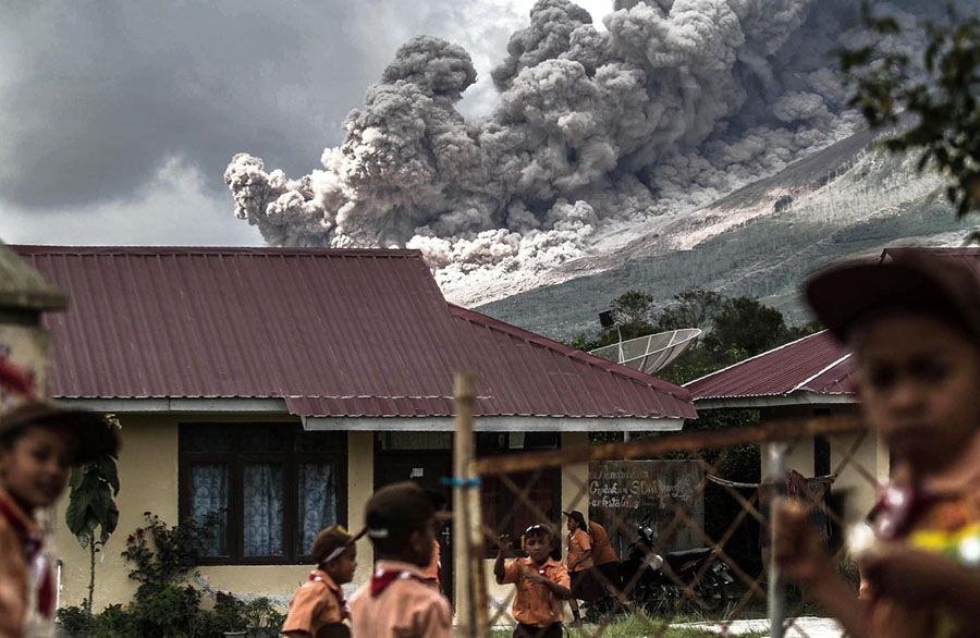 Read moreElementary schoolchildren play outside of their classrooms as Mount Sinabung spews thick volcanic ash as seen from Karo, North Sumatra province, on February 10, 2017. #