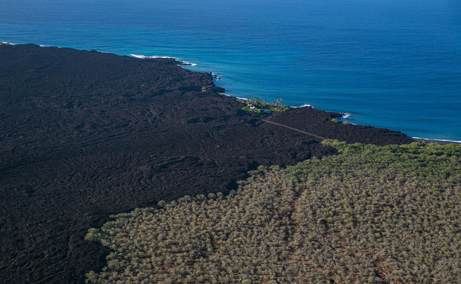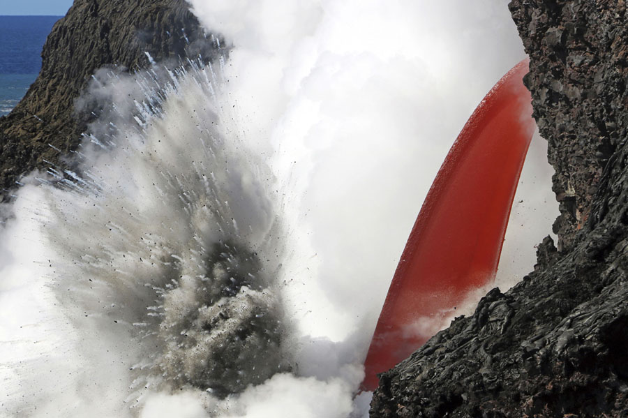 Read moreAn open lava stream pours out of a lava-tube exit, approximately 70 feet up on a sea cliff, falling into the ocean below, on January 28, 2017. Lava flowing from Kilauea began entering the sea in this location at the start of the year, intensifying into a "fire hose" of airborne lava. The flow subsided after a collapse on February 2. #