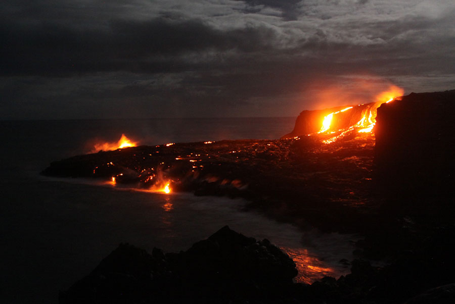 Read moreCoastal breakouts from Kīlauea on October 4, 2017. Over the previous weeks, there were at least three breakouts within 100 meters (330 feet) of the Kamokuna ocean entry. These lava cascades consisted of both ‘a‘ā and pāhoehoe flows onto the delta. This image was taken by a time-lapse camera of multiple lava cascades on the sea cliff on October 4. Just a few of the many resulting surface flows can be seen on the delta both below the cliff and near the front, which is lit by lava and moonlight. #