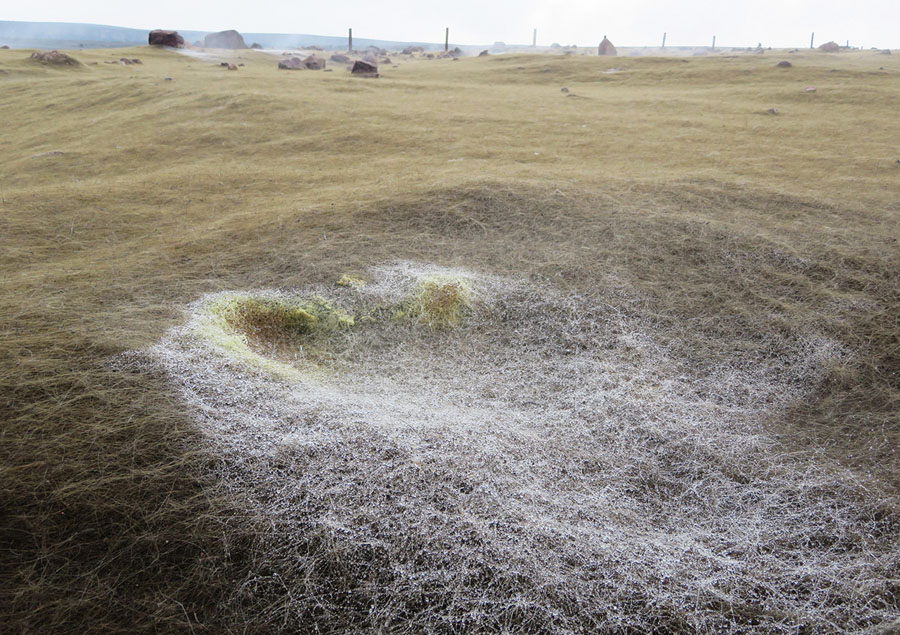 Read moreNumerous fumaroles are present near the rim of Kilauea's Halema'uma'u Crater, evident by the bright yellow sulfur deposits. In recent years these fumaroles have been covered by a thick carpet of "Pele's hair" (glassy strands of cooled lava) produced by the lava lake. Moisture emitted by the fumaroles collects as tiny water droplets on the fine hairs, resembling a thin dusting of snow, photographed here, on May 28, 2017. #
