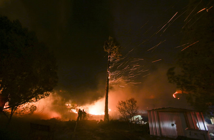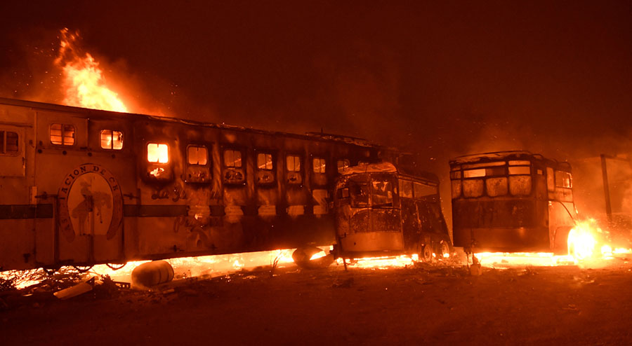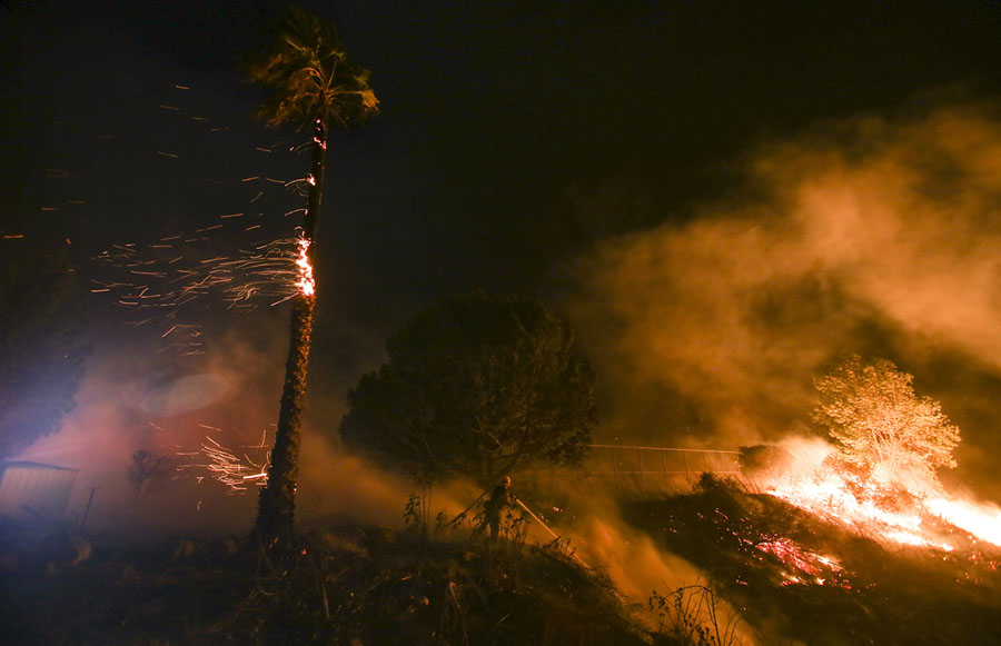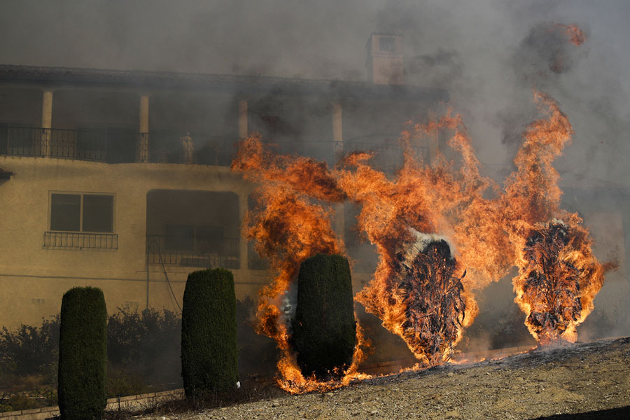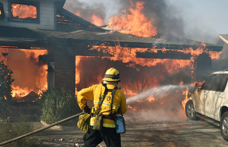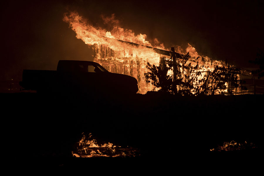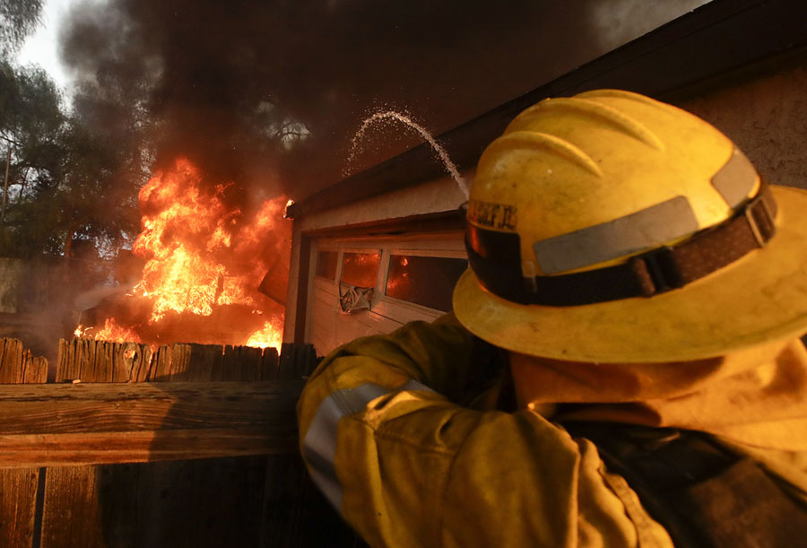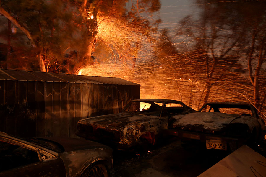 Some of the strongest Santa Ana winds recorded in years have been pushing several sudden and destructive wildfires across the hills and towns north of Los Angeles, burning thousands of acres and hundreds of structures and forcing tens of thousands to flee their homes over the past two days. Hundreds of firefighters are stretched across suburbs and foothills tonight, trying to contain fires that are racing westward, pushed by the fiercely blowing winds. Photographers across the region have been taking some remarkable images while covering these wildfires.