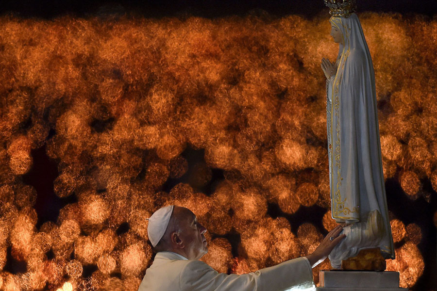Read moreHand-held candles burn in the background as Pope Francis touches the figure representing Our Lady of Fatima during his visit to the Chapel of the Apparitions at the Fatima shrine, in Fatima, Portugal, on May 12, 2017. Two of the three child shepherds who reported apparitions of the Virgin Mary in Fatima one century ago were declared saints on May 13, 2017 by Pope Francis. #