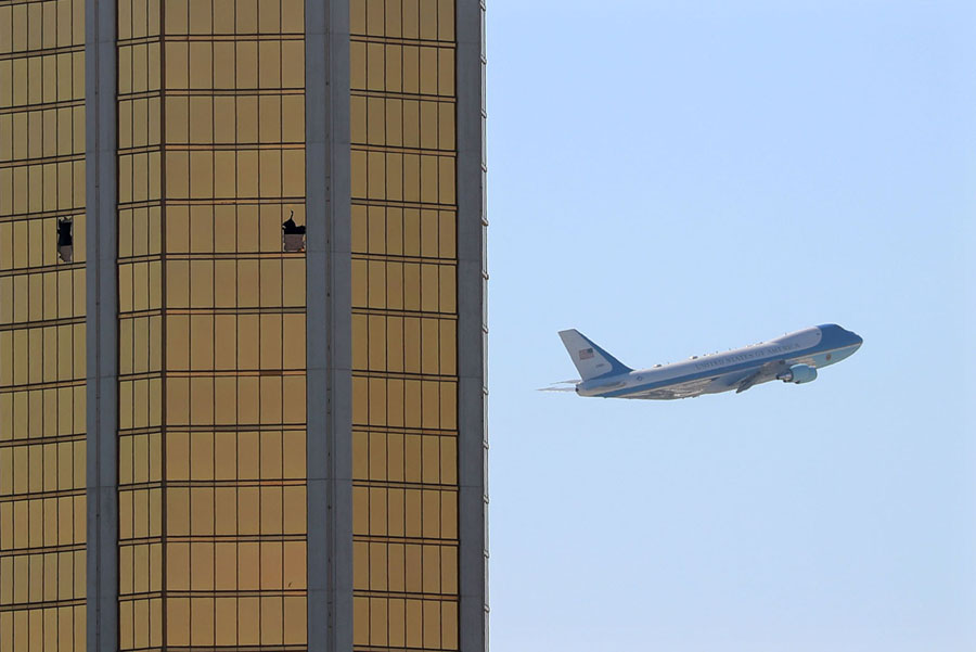 Read moreAir Force One departs Las Vegas past the broken windows on the Mandalay Bay hotel, where shooter Stephen Paddock conducted his mass shooting along the Las Vegas Strip on October 4, 2017. On the night of October 1, Stephen Paddock, holed up in his hotel room with 23 guns, opened fire on fans attending a concert across the street. He fired more than 1,000 bullets from the windows in a span of 10 minutes, killing 58 people and injuring another 546 before police entered his hotel room to discover him dead on the floor. At this time, authorities believe Paddock acted on his own, and have been unable to discover any motive for the attack. #