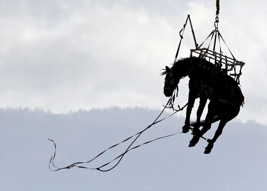 Read moreA Los Angeles County Fire Department helicopter carries a horse to Bowen Ranch in rural Apple Valley, California, on November 27, 2017. San Bernardino County firefighters, with assistance from the LAFD helicopter, rescued the horse from a 300-foot ravine. #