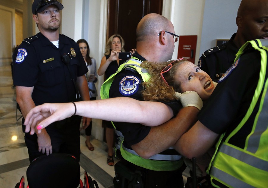 Read moreStephanie Woodward of Rochester, New York, who has spina bifida and uses a wheelchair, is removed from a sit-in at Senate Majority Leader Mitch McConnell's office as she and other disability rights advocates protest proposed funding caps to Medicaid on June 22, 2017, on Capitol Hill. #