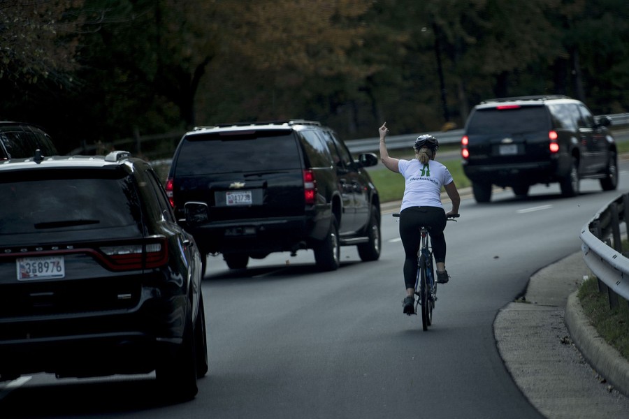 Read moreJuli Briskman, riding her bike, gestures with her middle finger as a motorcade carrying President Donald Trump departs Trump National Golf Course in Sterling, Virginia, on October 28, 2017. After the photo was published, Briskman posted it on her social media profiles, and decided to alert her employer, Akima, a government contracting firm, that the photo might go viral. Akima fired her for violating its policies, but someone shortly set up a GoFundMe page for Briskman. The page has raised more than $130,000 so far. #