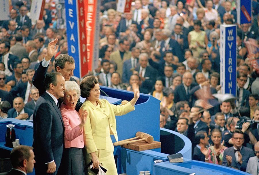 Read moreVice President Hubert Humphrey and his running mate, Sen. Edmund S. Muskie, with their wives shown at the final session Democratic Convention in Chicago following their nominations for president and vice president, on August 29, 1968. #